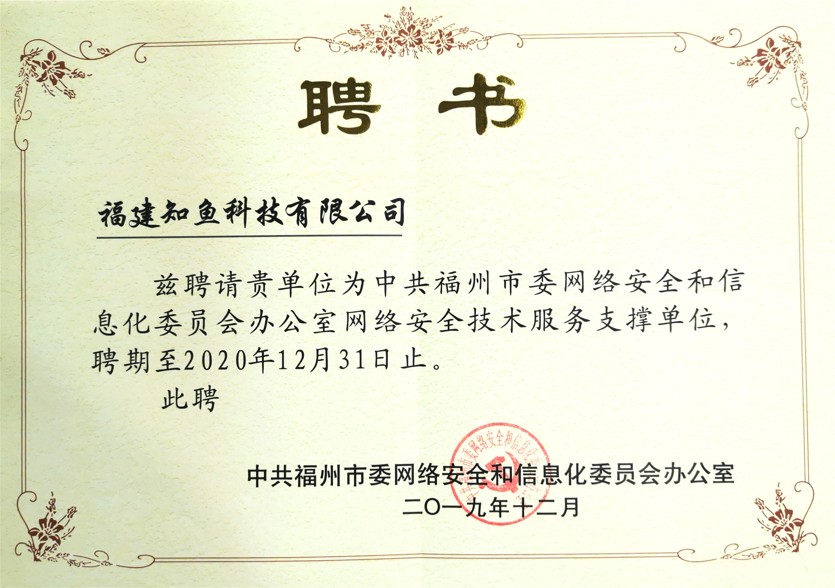 2019年12月,憑借網(wǎng)絡(luò)安全領(lǐng)域的技術(shù)優(yōu)勢(shì),知魚科技受聘為福州市委網(wǎng)信辦首批網(wǎng)絡(luò)安全技術(shù)支撐單位,為全市多領(lǐng)域提供網(wǎng)絡(luò)安全測(cè)評(píng)、網(wǎng)絡(luò)空間測(cè)繪、入侵檢測(cè)、安全防護(hù)等在內(nèi)的網(wǎng)絡(luò)安全綜合解決方案,為公共網(wǎng)絡(luò)安全保駕護(hù)航。